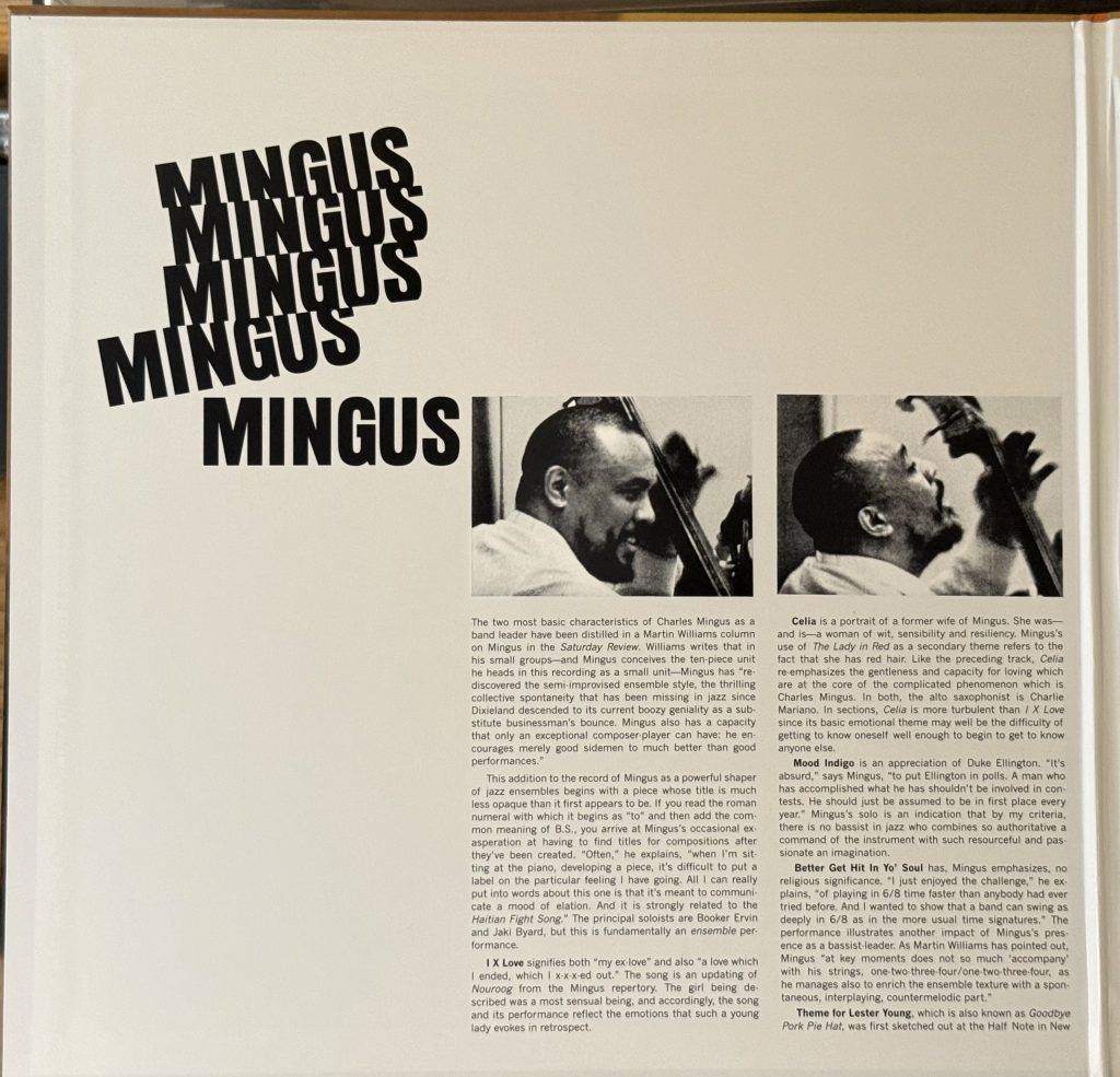 Last, “Hora Decubitus” appears in a new title, having originally been “E’s Flat, Ah’s Flat Too” on Blues and Roots. This is blues all right and a fast one, swung by Mingus and Richardson, then the rest of the band joining in. Dolphy’s solo switches out of time for a minute before he’s joined by the rest of the group. It’s a joyously swinging dance with each member of the group improvising across the tightly arranged charts, and a coda that calls to mind all the high points from the album as Mingus gets the last word.