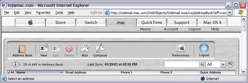 As promised during the 2003 MacWorld SF keynote, the at online address book in .Mac can now synchronize with your Address Book in OS X. In fact, if you’ve already been syncing your address book to .Mac with iSync, you don’t have to do anything but go into the address book preferences and turn on the synchronization. The online Address Book will then use the synced copy of your address book already sitting in your .Mac account and bring itself up to date.