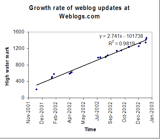 I still can’t separate how much of this is due to new weblogs coming on line vs. old ones blogging more frequently. I suspect that this would require more data than Weblogs.com currently collects.