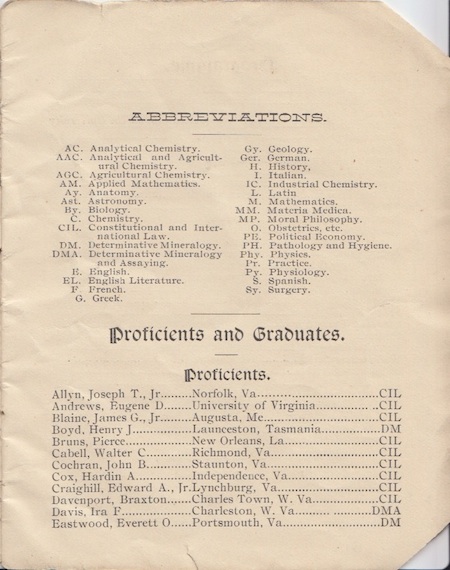 It’s fun to look at the document and realize how different the University was then. Most of the degrees are professional or graduate degrees because the four-year bachelors degree was virtually unknown then. It wouldn’t be until a few years later that curriculum reform at Virginia and other universities standardized the four-year undergraduate degree that we are all familiar with today.