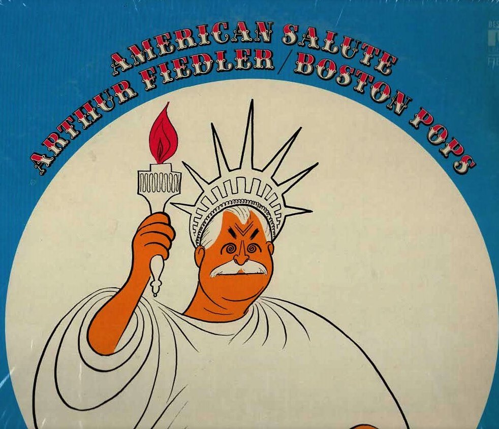 Both covers feature Al Hirschfeld caricatures of Fiedler—this one in an attractive Statue of Liberty get-up. Both have some marches — in this case, “American Patrol,” an 1885 march by F.W. Meacham. Both even feature some lesser known classical works, in this case Morton Gould‘s 1942 “American Salute” and William Schuman’s “Chester” from New England Triptych. And then there’s the tracks on either side of “Chester” — the “Tennessee Waltz” and “By the Time I Get to Phoenix,” both of which feature the guitar of Chet “Mr. Guitar” Atkins.