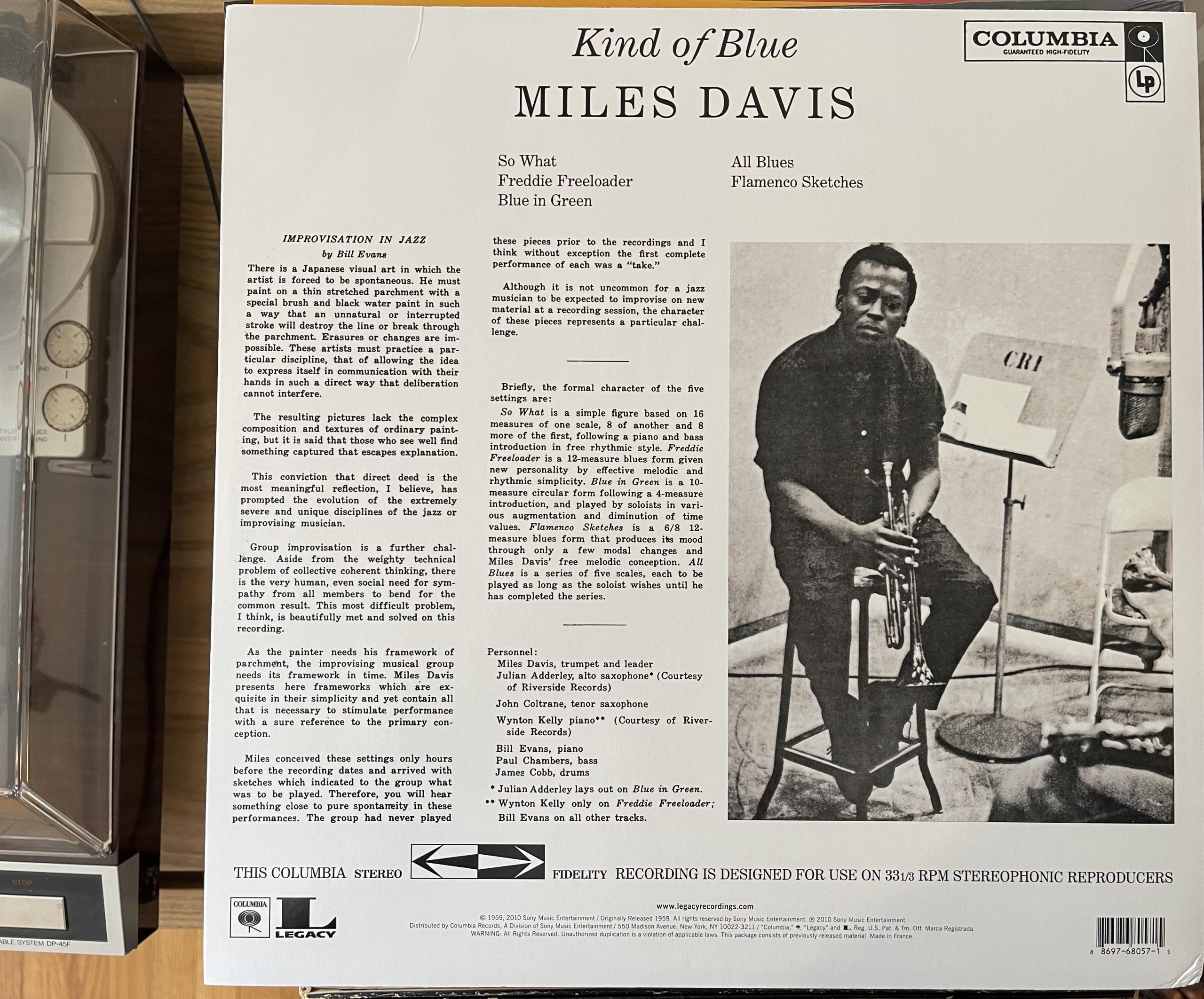 This was one of the few Miles albums that put the names of each player on the cover, even pianist Wynton Kelly, who only sat in on “Freddie Freeloader.” As we’ve learned in this series, the players matter in all these recordings, but they especially matter here. This is because, as Bill Evans notes in the liner notes to the album (below), almost everything you hear on the album was a first take.