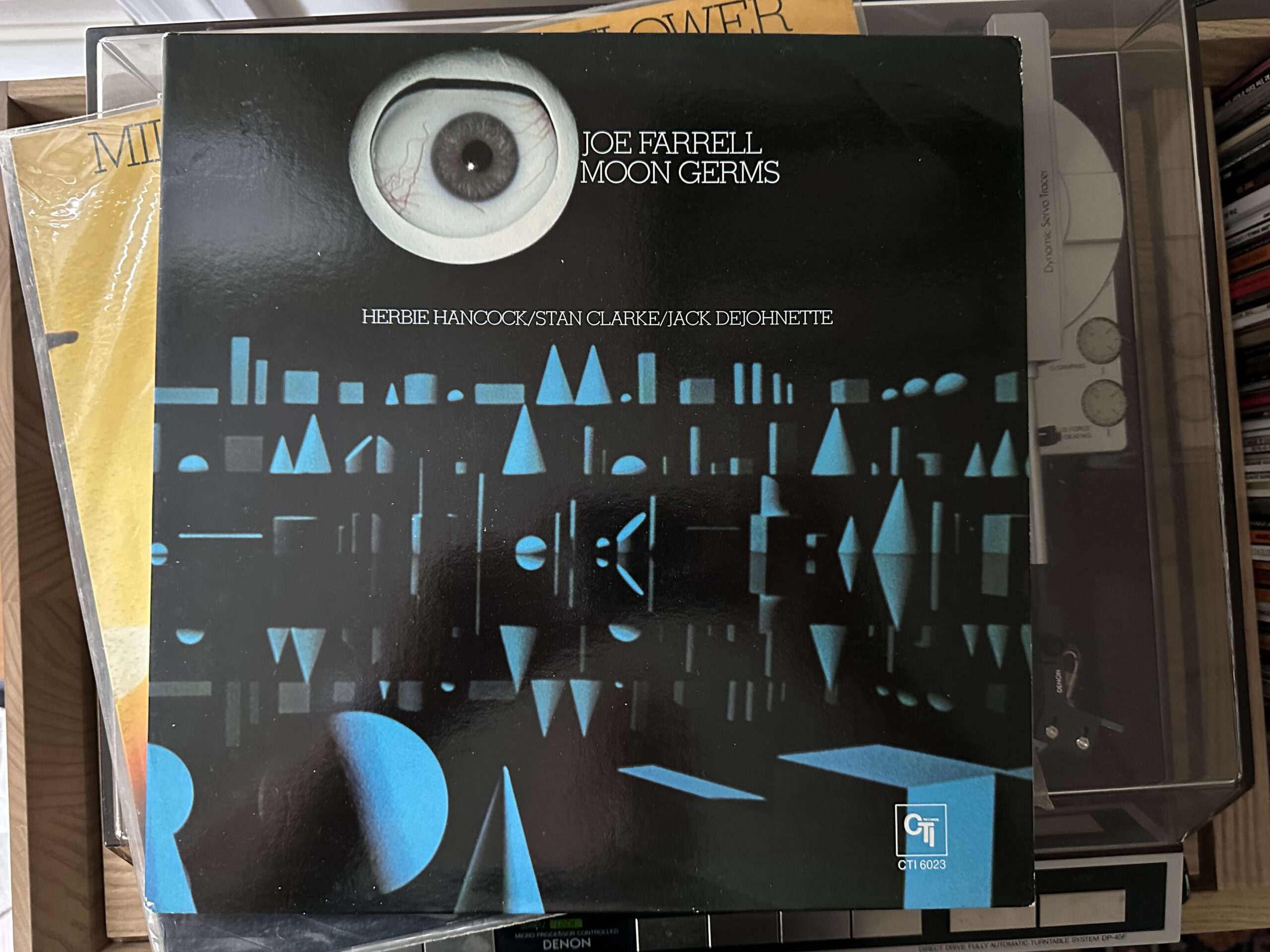 Such was the case with Moon Germs, the first album I bought by Joe Farrell. I was searching for other records on eBay—probably looking for Herbie Hancock albums—and this cover popped up. I stared at it: the geometric forms, the slab serif typography, and most of all that weird eyeball. This was back in 2018, before I had heard of Farrell, before I fell down the CTI rabbit hole. It didn’t matter; I had to pick this up.