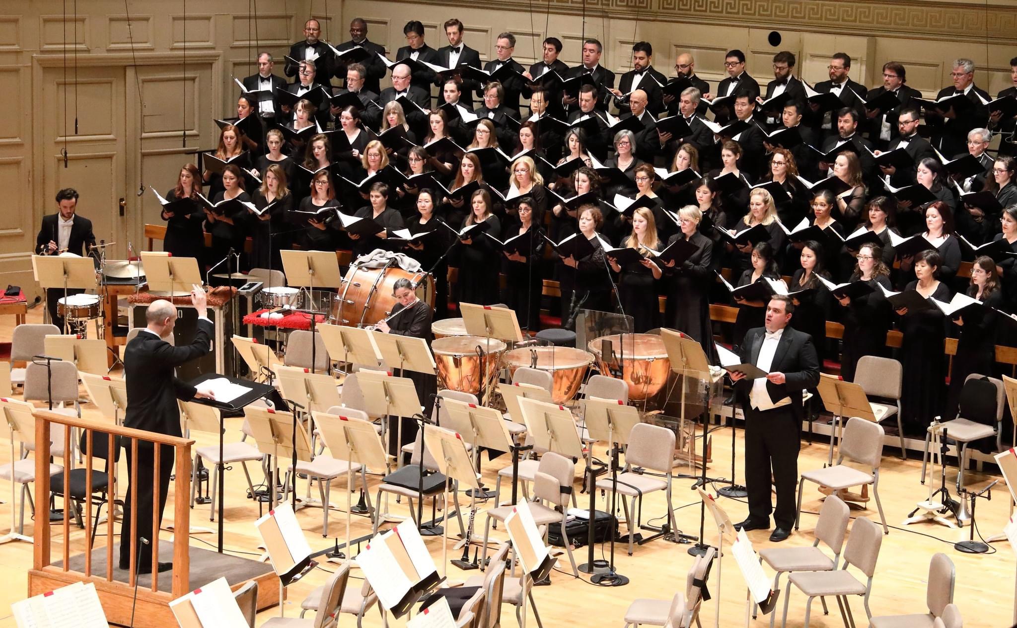 TFC performing “On Leaving” at Symphony Hall in 2019 with percussionist Kyle Brightwell, assistant principle flute Elizabeth Klein, and tenor Matthew Anderson, James Burton conducting. Photo courtesy Hilary Scott/BSO