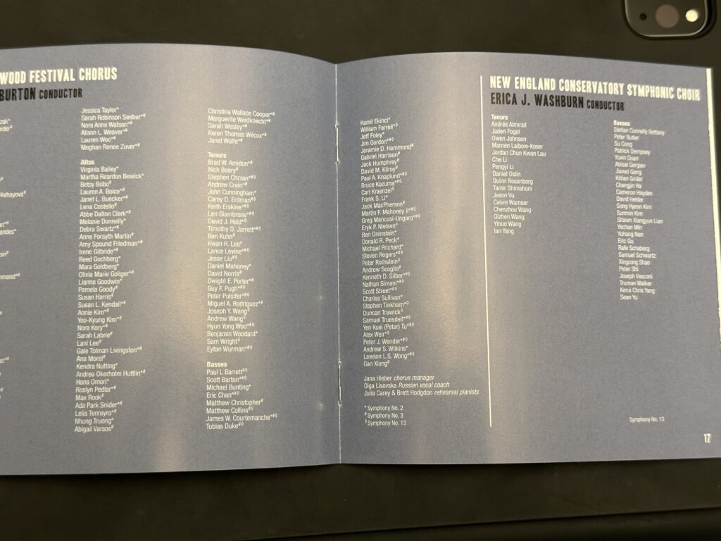 We were supposed to do Symphony No. 3 the following season, but I think we all know what happened in March 2020. So everything moved out by two years, and we finally sang it in the summer of 2022 at Tanglewood, initially under the baton of BSO assistant conductor Anna Rakitina, alongside Borodin’s Polivtsian Dances. We returned to the work that fall in Symphony Hall, in an unusual program that presented the work with Bernstein’s Chichester Psalms and his Serenade for violin and orchestra. Number 3 is arguably a better work, but still early, and while it doesn’t feature a role for factory siren like Number 2, it still has a lot of shouted Soviet propaganda.