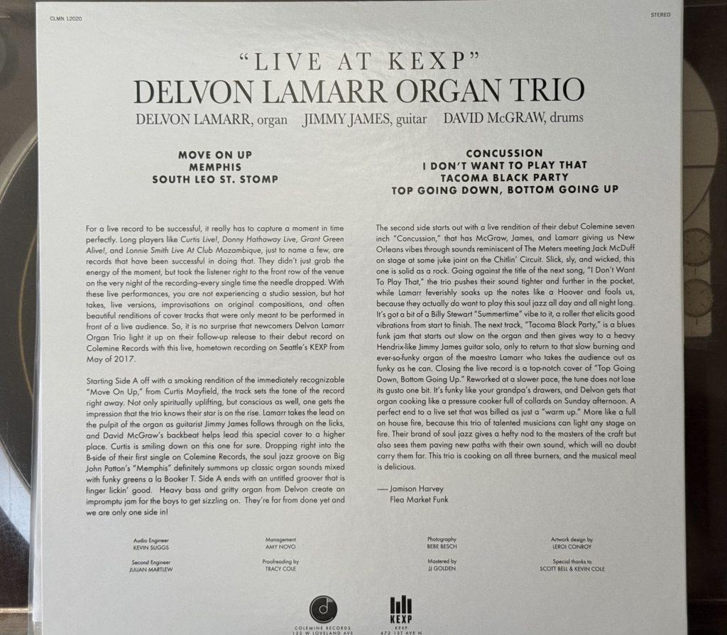 “God Rest Ye Merry Gentlemen (Trio Version)” starts right in, sounding a bit like Jimmy’s version of “Greensleeves.” The trio with Quentin Warren and Billy Hart swings convincingly, with Billy’s snare work so powerful that it causes a secondary rattle somewhere between the snares and the ride cymbal. Jimmy spools off riff after riff in his solo, as Quentin Warren walks around the chords, keeping the rhythm going strong. At several points, it sounds as though the group will fade out, but the producers wisely keep rolling tape as the trio lands the hottest number on the whole record at the very end. Finally as the trio returns to the opening vamp, the engineers bring down the sliders and fade it out into the dark.