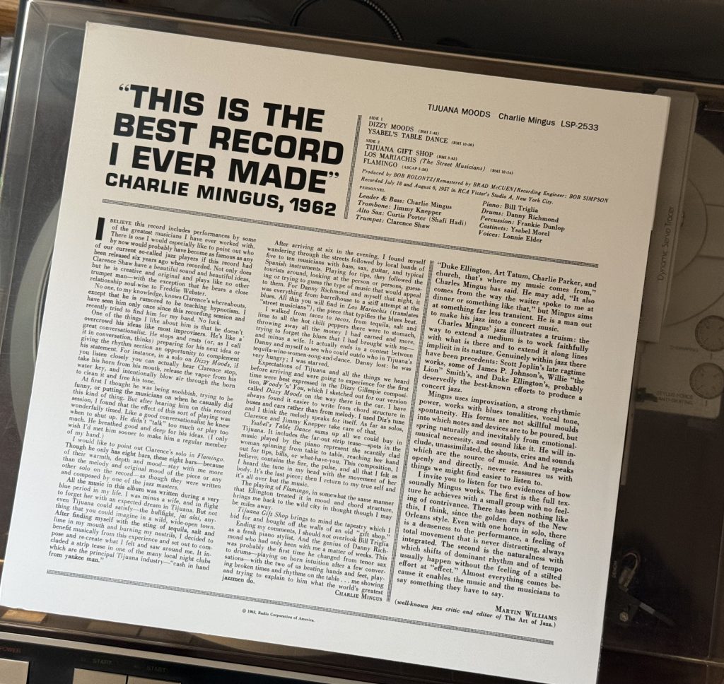 “Tijuana Gift Shop” opens with a brisk riff by Richmond and Dunlop, followed by a playful melody in the horns that seems to embrace the wild energy of the town; Mingus’ notes state it was inspired by a tapestry that he “bought off the walls of an old ‘gift shop.’” The band engages in some inspired collective improvisation, with hardly any single-horn solos until Hadi’s lovely melody at the end, sounding a closing cadence reminiscent of Miles’ Sketches of Spain (still three years in the future when this album was recorded!).