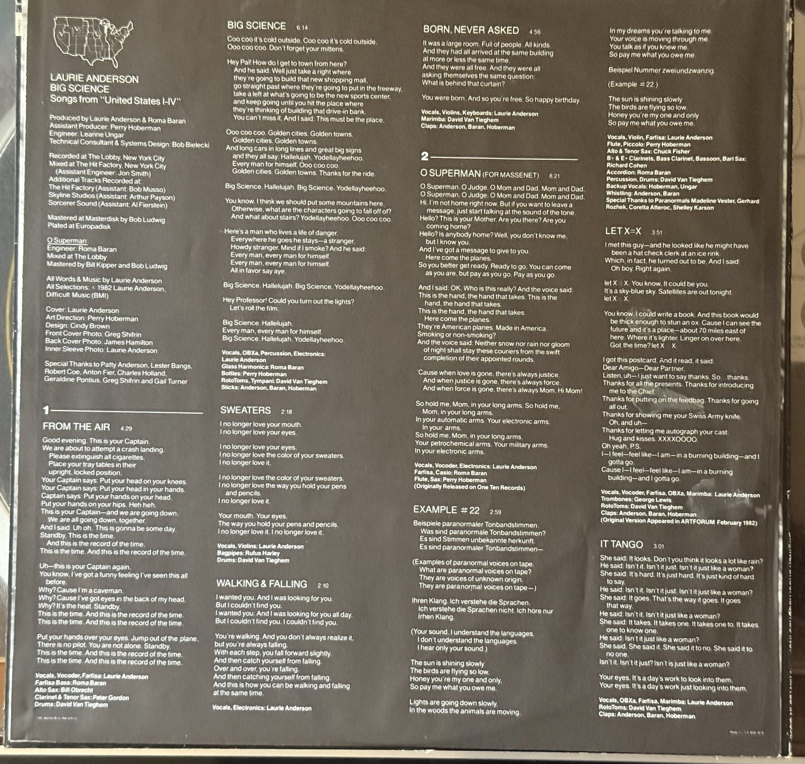 The album was released in April 1982. Produced by Roma Baran, who also played keyboards, accordion and percussion, and featuring installation artist Perry Hoberman on reeds, experimental composer Peter Gordon on clarinet and tenor sax, Bill Obrecht on alto sax, and composer David Van Tieghem on drums, marimba and percussion, the album featured a variety of performances drawn from a long-form show that she would eventually perform and record as United States Live I – IV. The material is much more melodic than the numbers on You’re the One I Want to Share My Money With, but still far from traditional song structures; built on loops, repetition, and open-ended chords, the pieces on Big Science feel like alerts from the future.