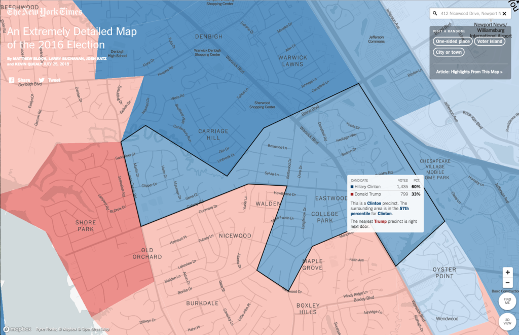 New York Times: An Extremely Detailed Map of the 2016 election. What’s fascinating to me is how transitional some of the maps are—and how well they map to urban/rural, high income/low income, and white/black lines. My old neighborhood growing up went for Hillary at about a 60%-33% margin, less than neighboring streets that are (or were 20 years ago) home to lower income housing, but much more than some of the other areas of our suburbs.