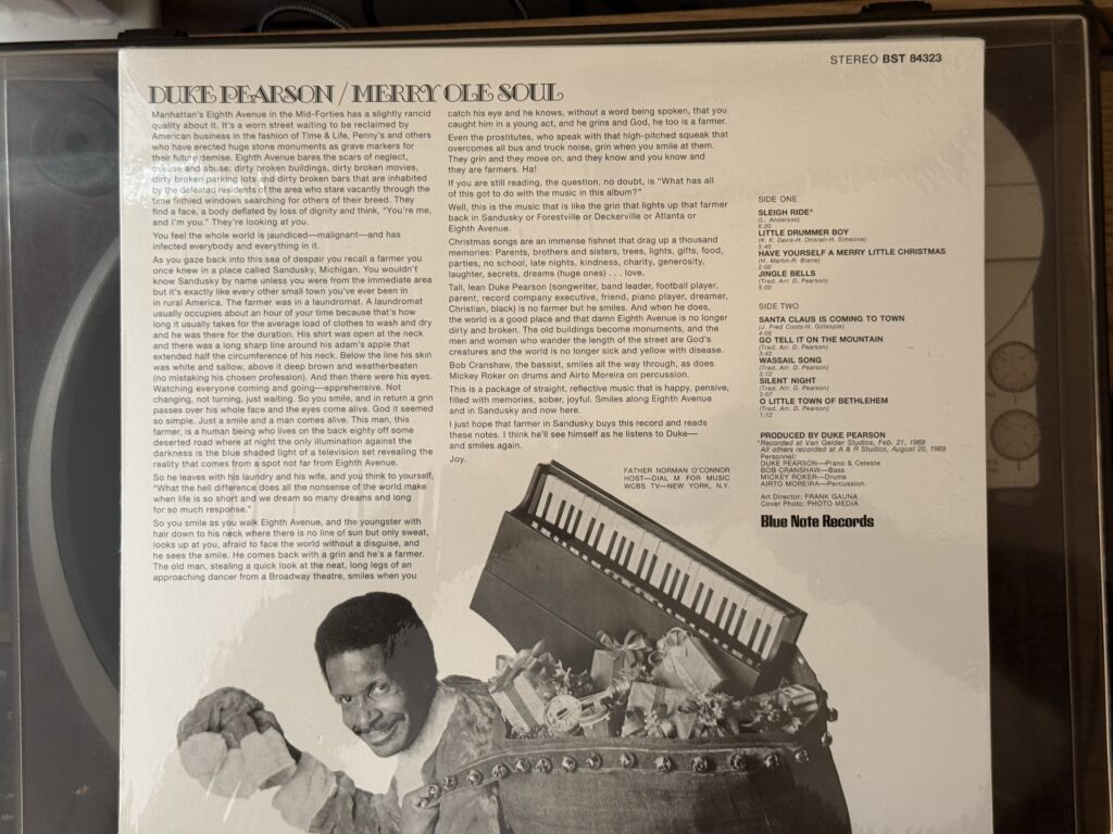 We’ve heard the opening track “Sleigh Ride” in this blog before; it kicked off my 2022 Christmas jazz hour on my Exfiltration Radio series, “Riding in a Wonderland.” At the time, I wrote, “This uber-cool take on “Sleigh Ride” is viewed through the prism of spiritual jazz, with a drone in the bass and drums that’ll knock your socks off.” Well, that’s true, but there are some really spectacular fine details in the arrangement as well that are worth expanding upon. The open chords in Pearson’s introduction, the pervasive swing, and the genius switch from piano to celeste for that opening melody: all perfection. And listen to what the bass is doing in that opening! That syncopated drone on that fifth of the scale, in octaves, remains the steady pulse throughout the entire intro, first verse, first solo, all the way into the bridge where suddenly the arrangement snaps into a more conventional bebop pattern, but only for sixteen bars! And the stride-influenced piano rumble that Pearson adopts on the second bar (“there’s a birthday party at the home of Farmer Gray…”)!