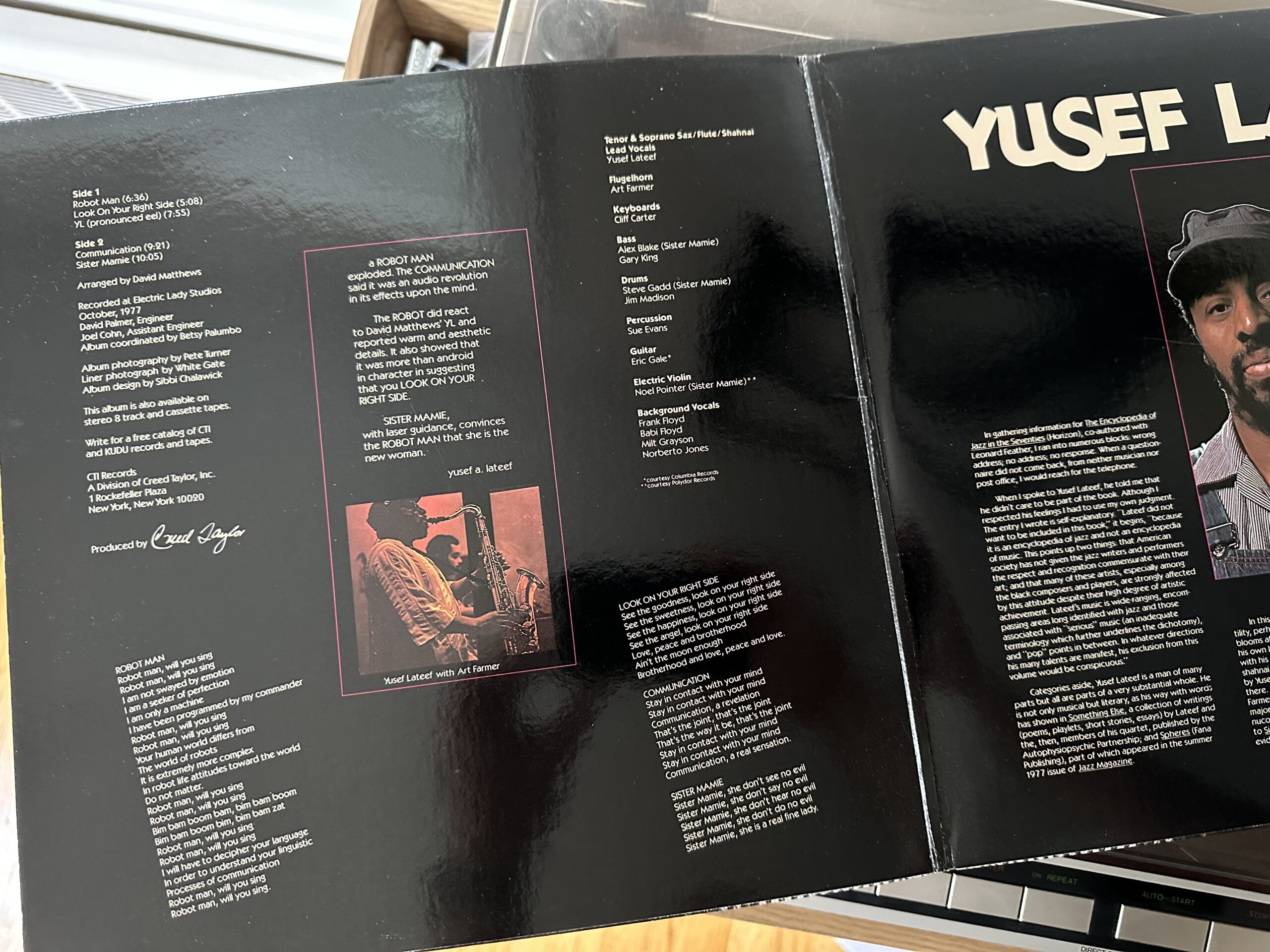 The opening track, “Robot Man,” is probably the boldest of these statements. No horns are heard for the first two minutes, just a funk backing track with Lateef singing. You might be tempted to turn it off! But after the opening two minutes comes Lateef’s soprano sax, and suddenly we’re in a very different sound space. Lateef was a careful listener and a brilliant improviser, and combined those into an absolutely rock solid jazz-funk conception. The rest of the track is pedestrian, but Lateef’s solo is incandescent, escaping into other tonalities while still staying absolutely funky.