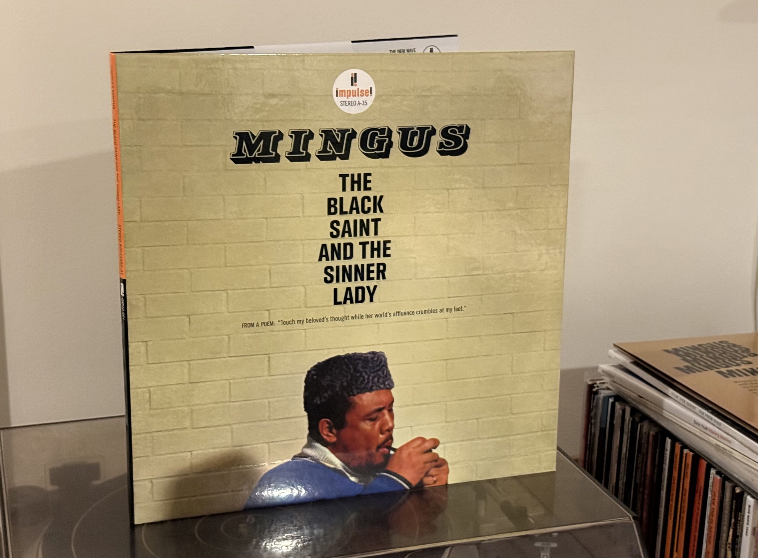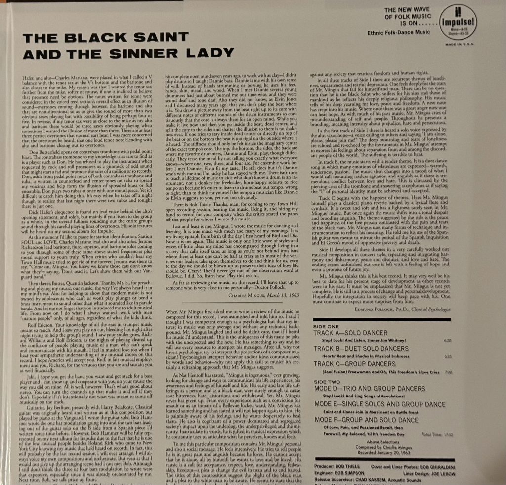 Mingus came to Impulse! following the near-disaster of his Town Hall concert, at which he premiered what eventually became his long-form composition Epitaph in a “jazz workshop” model, with the players working out ideas on stage. In the liner notes, he thanks producer Bob Thiele (who had become the lead at Impulse! following Creed Taylor’s decampment for Verve) for “for coming to my Town Hall session, hearing the music, liking it, and hiring my band to record for your company when the critics scared the pans off the people for whom I wrote the music.” He found the experience congenial, noting, “This is the first time the company I have recorded with set out to help me give you, my audience, a dear picture of my musical ideas without that studio rush feeling, Impulse went to great expense and patience to give me complete freedom…” He also said “Throw all other records of mine away except maybe one other. I intend to record it all over again on this label the way it was intended to sound.” We’ll hear the result of that session next time.