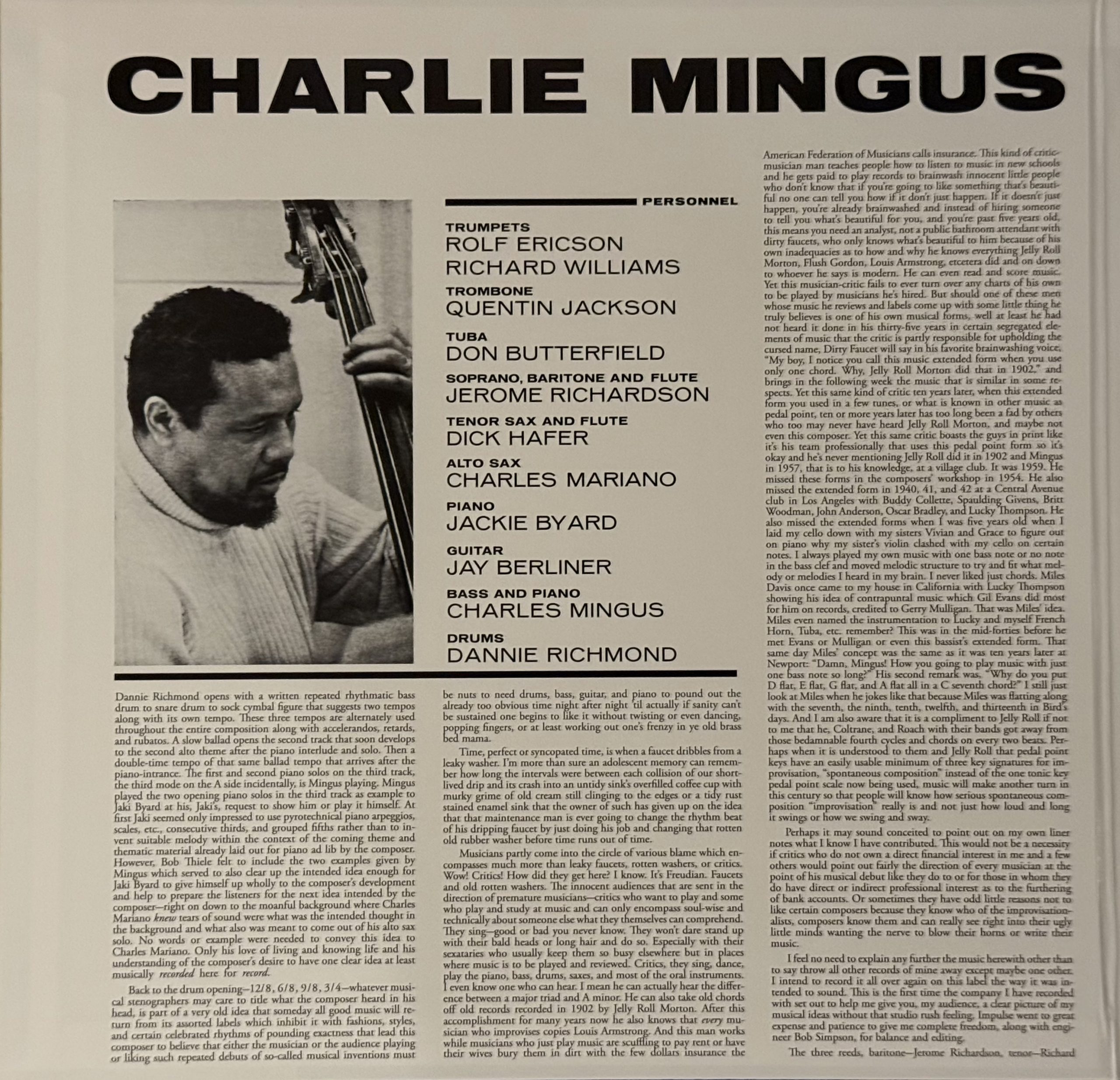 Effectively it was someone else’s orchestra. Bob Hammer, a pianist who had performed with Mingus on his totally bonkers A Modern Jazz Symposium of Music and Poetry and would later play with Johnny Hartman, had formed the orchestra only to have Mingus take it for a run at the Village Vanguard for six weeks, during which time he worked out much of the compositions of the album. In addition to Hammer’s arrangements, the group also featured the redoubtable Dannie Richmond on drums, Don Butterfield on tuba, Jerome Richardson on soprano and bari sax and flute, Charlie Mariano on alto sax, Dick Hafer on tenor sax, Rolf Ericson and Richard Williams on trumpet, Quentin Jackson on trombone, Jay Berliner on classical guitar, and Jaki Byard on piano. Byard, hailing from Worcester, Mass, had played professionally from age 16, was drafted into the Army at age 19 (where he mentored the Adderley brothers), then returned to Boston where he played with musicians including Sam Rivers and Mariano. Byard joined Mingus’ band with his legendary Town Hall concert in 1962 and played regularly through 1964, and off and on in the bassist’s bands through the end of his life.
