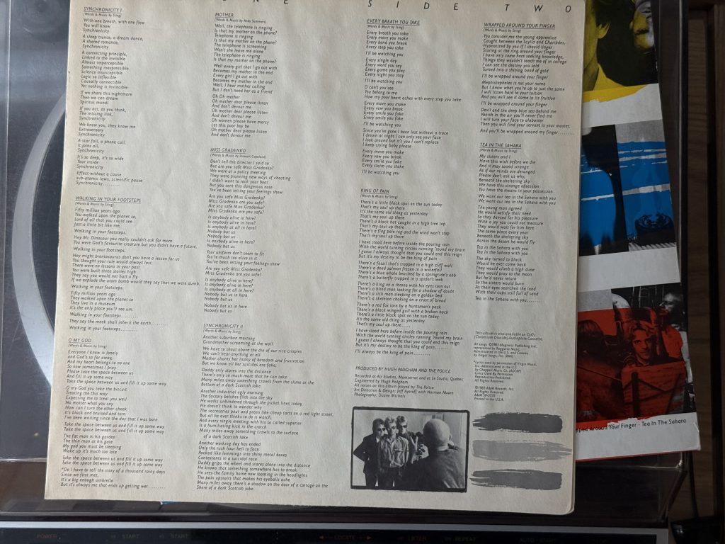 Tensions were high because the band was pulling in two different directions. Sting had come in with songs in a very pop direction that left most of the reggae influences behind; Stewart and Andy still wanted to have a go at creating the songs as a collective. Sting and Stewart did actually come to blows over “Every Breath You Take” as these approaches collided. Ultimately, while the sound of the album is remarkably consistent, it reflected this tension, with more experimentation and group energy on Side 1—including a song each by Copeland and Summers—and an almost unbelievable lineup of pop songs on Side 2.