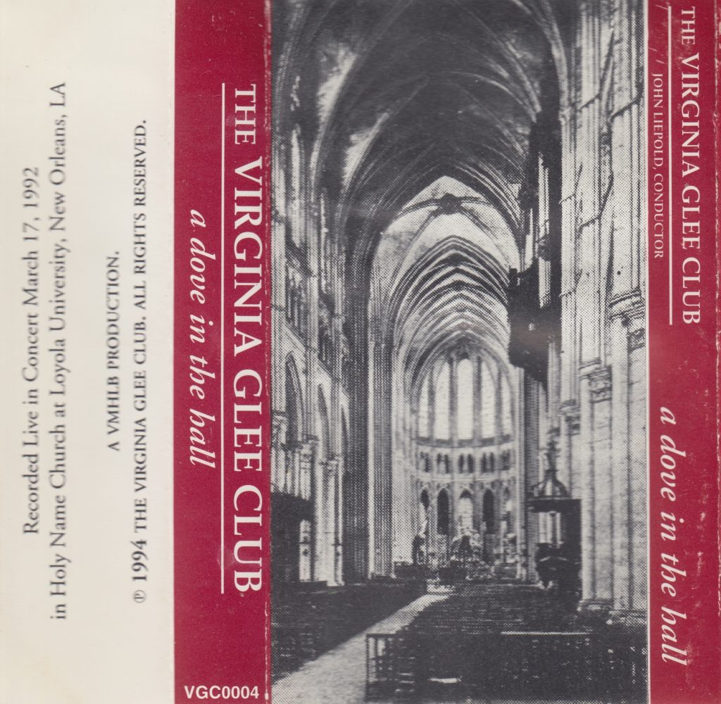 We have a twofer today, on the cusp of the weekend long celebration of the Virginia Glee Club’s 150th anniversary. The first new album on Bandcamp is A Dove in the Hall. Recorded on the Glee Club’s 1992 Tour of the South under John Liepold, this concert features the Club’s 1991-1992 repertoire in an entirely different acoustical setting. While tunes such as “Come, Heavy Sleep” and “Soon-Ah Will Be Done” had featured on the Club’s setlists that year, in the remarkable resonance of Holy Name Chapel at Loyola University they took on entirely new dimensions. Indeed, throughout the recording you can hear Liepold and the group adjusting their performance to the echo in the hall, at times lengthening cutoffs by a full measure to let the reverb add new colors to the performance. As conductor Robert Shaw once said, “If you want the Dove to descend, you have to clean out the birdcage,” and this group had done that in spades. Listen below.