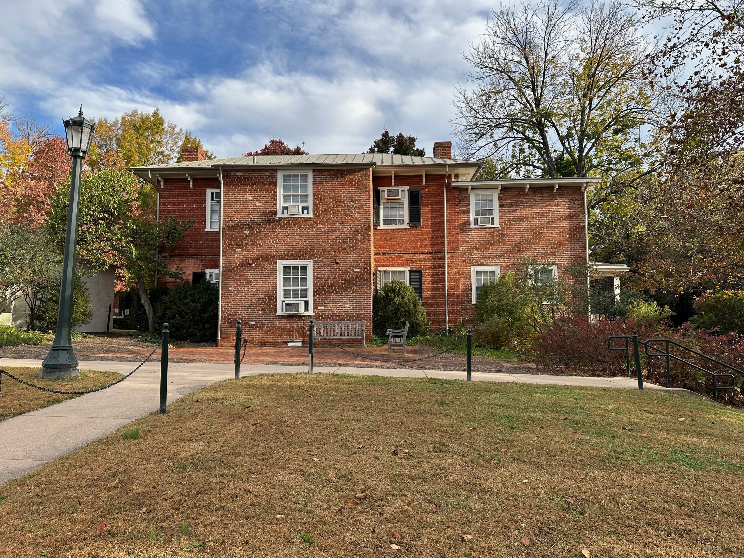 So it was in a pensive mood as I walked back to my hotel from breakfast, and decided to take a different route around Grounds. And found myself walking through Dawson’s Row. I’ve only written a little bit about the Row — all that remains of a set of buildings of varying purposes and origins that originally stretched in an arc from Monroe Hill to where the front steps of New Cabell Hall now stand. Some were originally constructed as dormitories; these were demolished over the years, and no trace of them remains.
