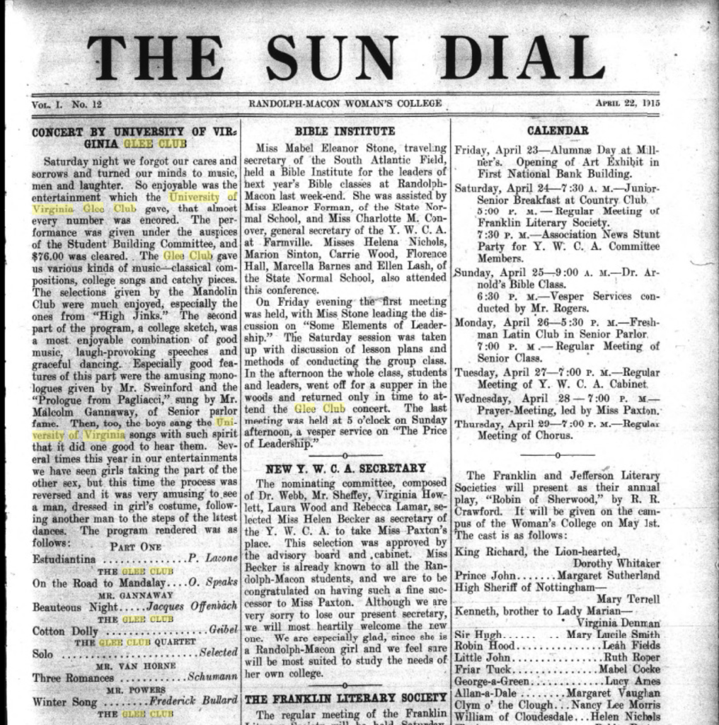The “Winter Song” was on a concert program at Randolph-Macon College on April 17, 1915, some seventy-plus years earlier than previously known. 1914-1915 was the first year that there was a “modern” Glee Club, conducted by a UVA faculty member (Alfred Lawrence Hall-Quest), and took place a day after a concert in Richmond. The concert was well received; the student newspaper mentioned that the concert “turned our minds to music, men and laughter” and that “almost every number was encored.”