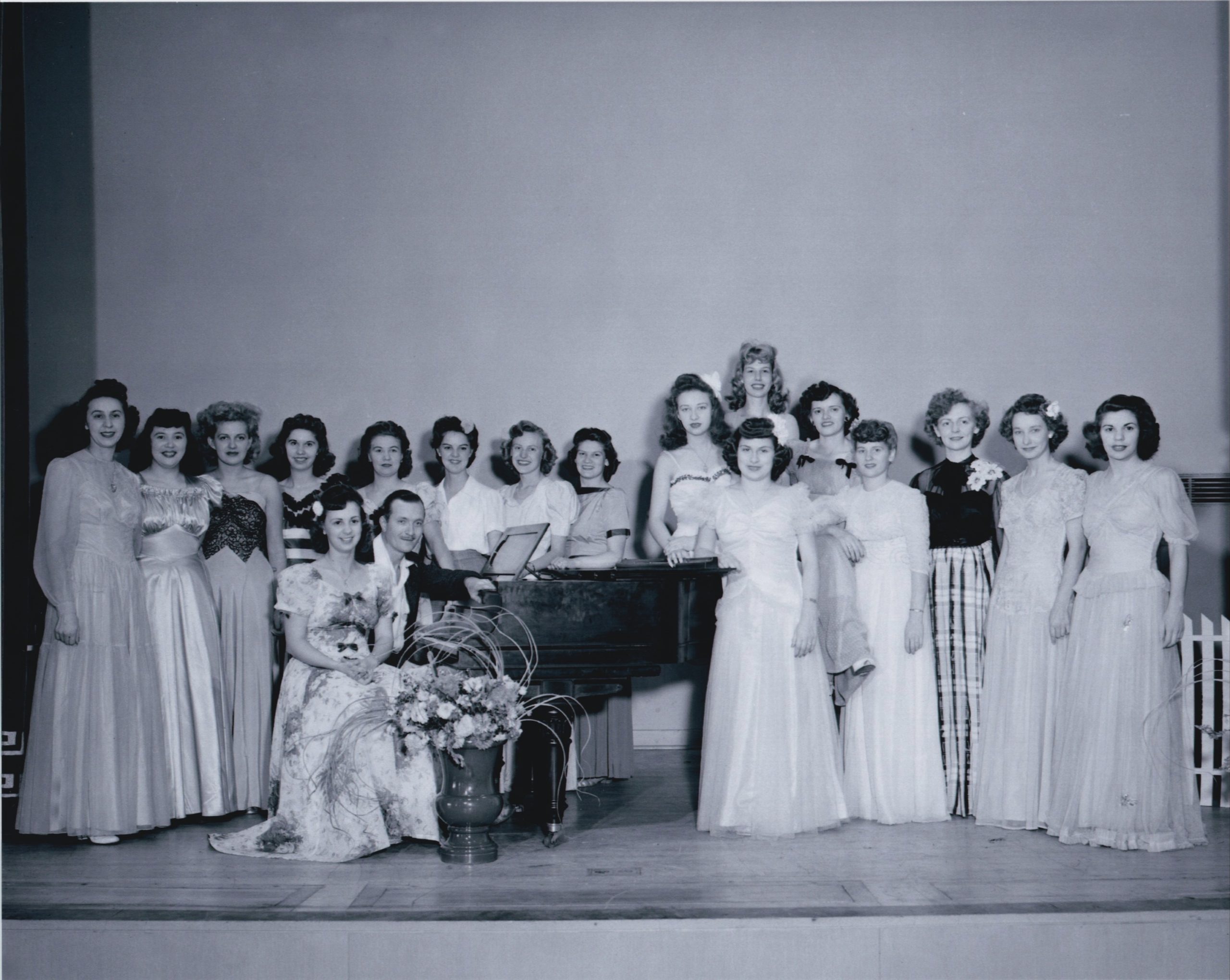 Location: Rehearsal and performance spaces with stages were rare at UVa in the 1940s, and would likely either have had a painting (The School of Athens in Old Cabell Hall) or a blackboard (any of the Music Department’s practice rooms or any lecture halls) behind the group. Where was this taken?