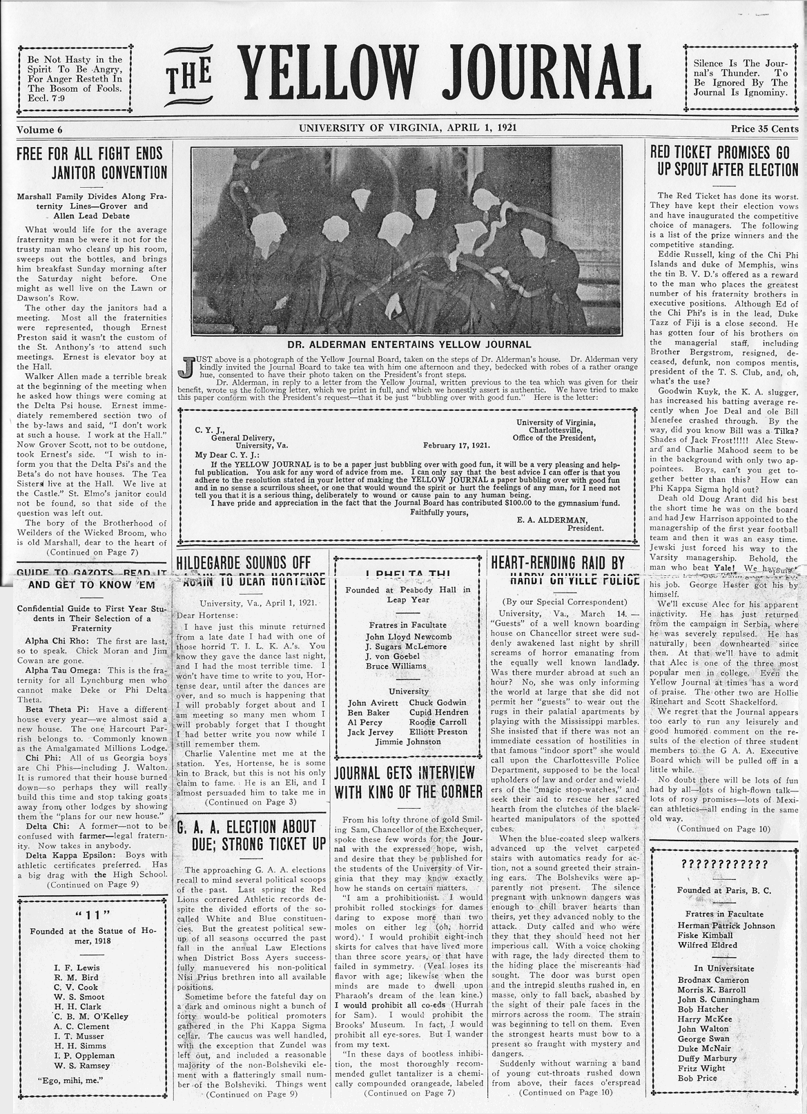 Also features boxes describing various fictional fraternities (“I Phelta Thi”, “11”, “?????????”), a purported letter from University president Edwin A. Alderman, and a photo of the Journal‘s editorial board with their faces burned out of the photograph.